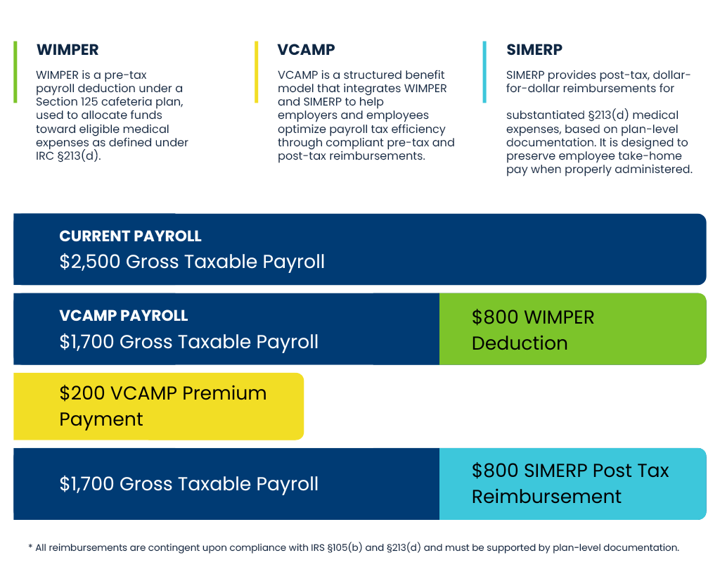 VCAMP is a structured enhancement to your existing Section 125 plan. It integrates three coordinated components—WIMPER, VCAMP, and SIMERP—designed to align with IRS Sections 125, 105, and 213(d). The program is structured to support compliant tax savings and employee benefit reimbursements without increasing employer compensation costs.